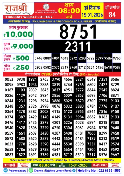 Rajshree Daily Lottery 1PM Result 15.01.2026