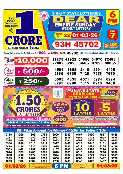 Sikkim State Dear Lottery 6PM Result 28.02.2026