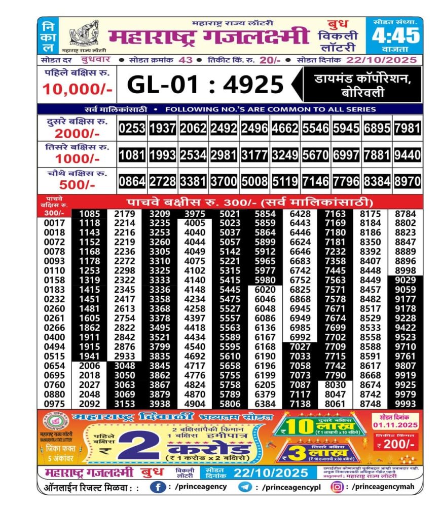 Maharashtra Gajlaxmi Weekly Lottery 4.45PM Result 22.10.2025