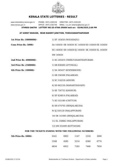 Kerala Lottery Result SS470 Declared 3.06.25