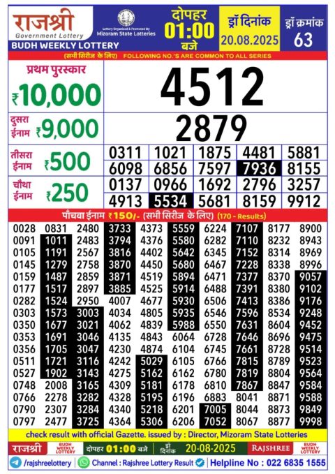 Rajshree Daily Lottery 1PM Result 20.08.2025