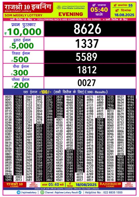 Rajshree Daily Lottery 1PM Result 18.08.2025