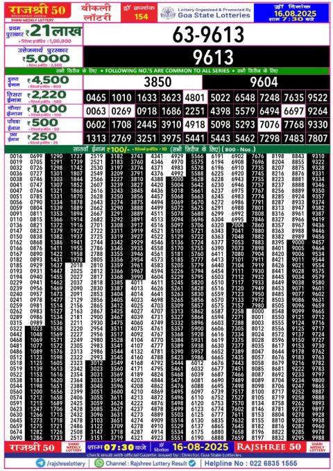 Rajshree 50 Weekly Lottery 7:30PM Result 16.08.2025