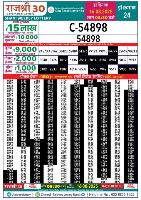 Rajshree 30 Weekly Lottery 8:30PM Result 16.08.2025