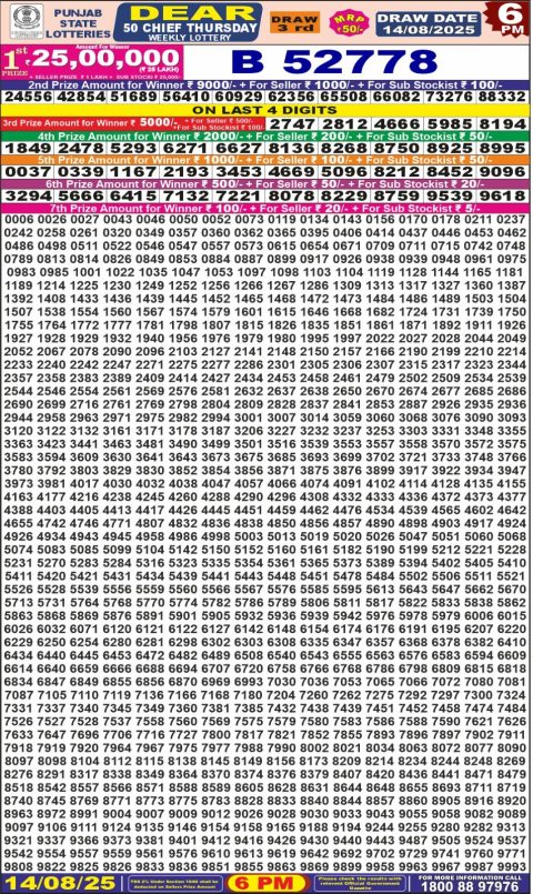 Dear Daily Lottery 6PM Result 14.08.2025