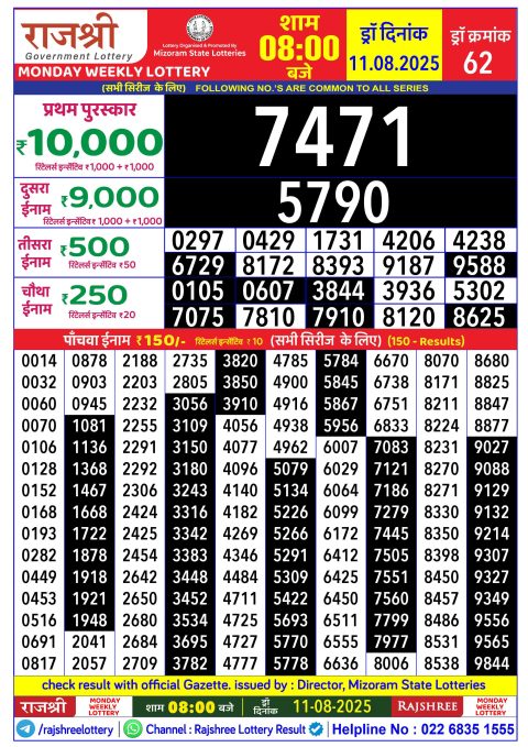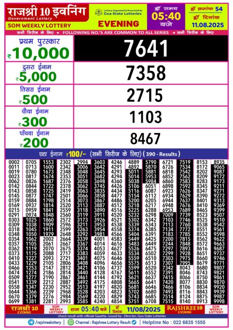 Rajshree 30 Weekly Lottery 8:30PM Result 11.08.2025