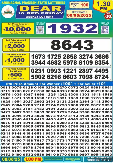 Dear 10 Daily Lottery 1:30PM Result 08.08.2025