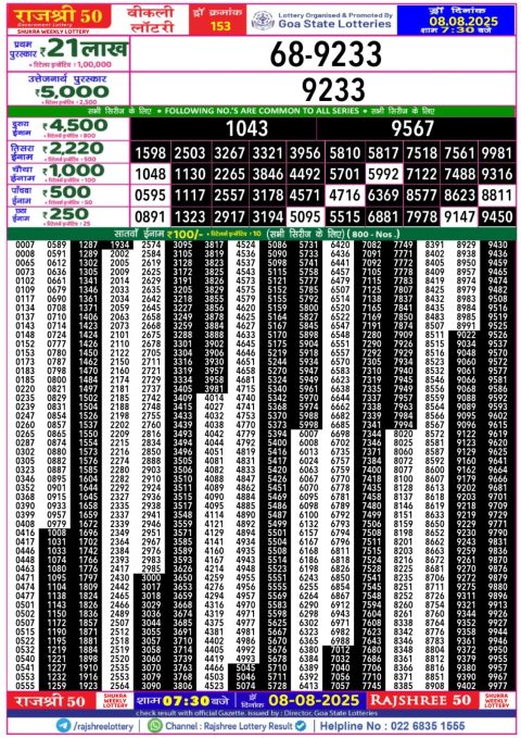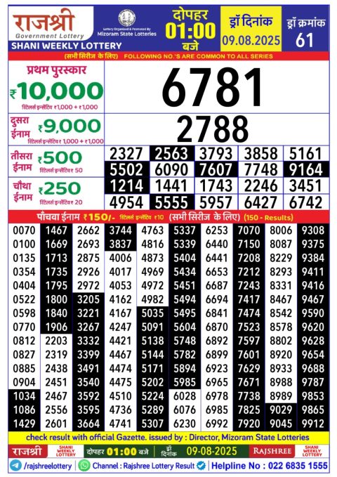 Rajshree Daily Lottery 1PM Result 09.08.2025