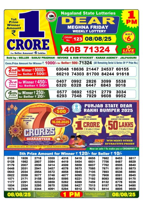 Dear Daily Lottery 1PM Result 08.08.2025