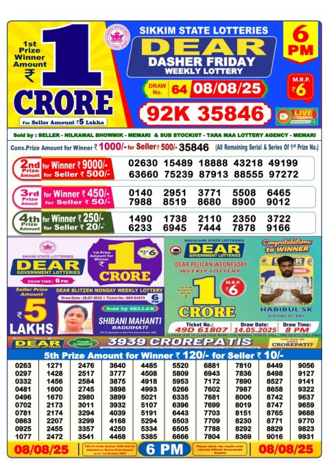 Dear Daily Lottery 6PM Result 08.08.2025