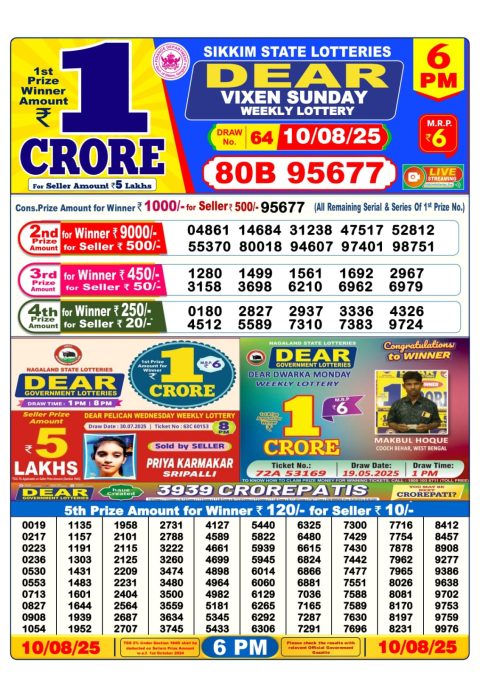 Dear Daily Lottery 6PM Result 10.08.2025