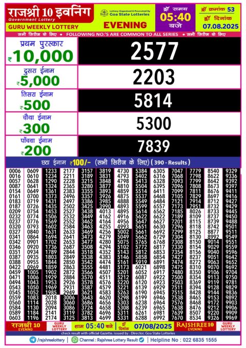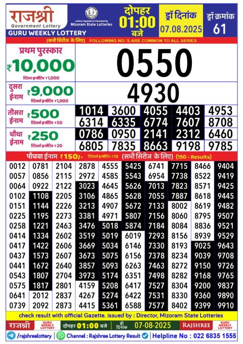 Rajshree Daily Lottery 1PM Result 07.08.2025
