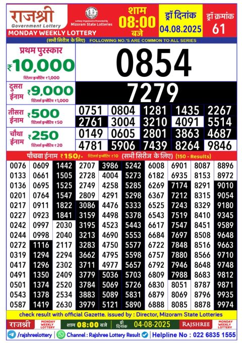 Rajshree Daily Lottery 1PM Result 05.08.2025