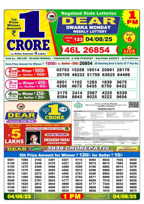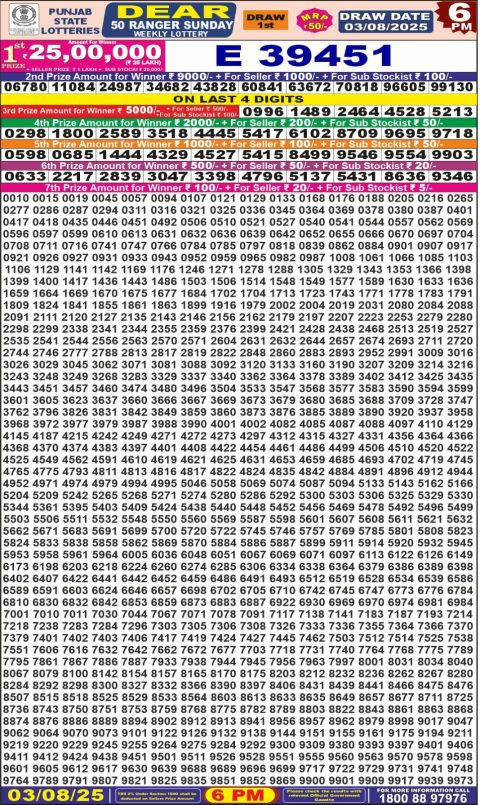 Dear 10 Daily Lottery 1:30PM Result 03.08.2025