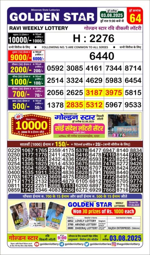 Golden Star Daily Lottery 9PM Result 03.08.2025