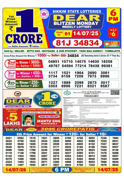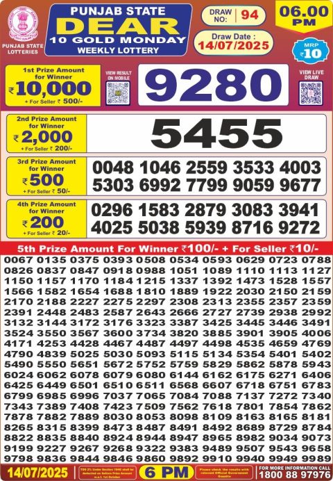 Dear Daily Lottery 6 PM Result 14.07.2025