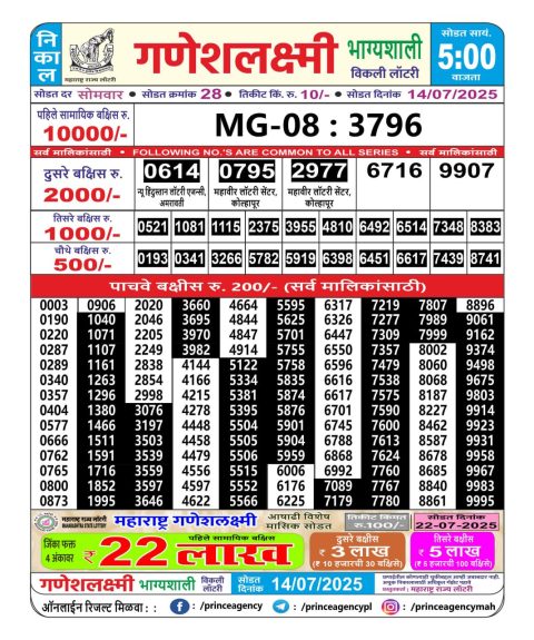 Dear Daily Lottery 8 PM Result 14.07.2025