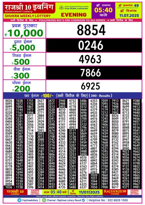 Rajshree Daily Lottery 1 PM Result 11.07.2025
