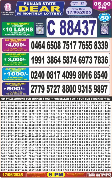 Dear 10 Daily Lottery 7 Pm Result 18.06.2025