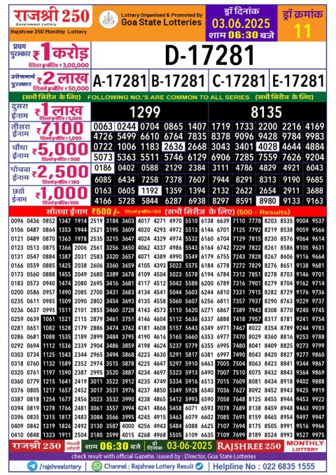 Rajshree 250 Monthly Lottery Result 3.06.2025