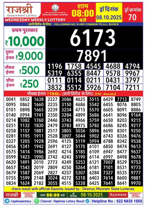 Rajshree Weekly Lottery 9 PM Result 08.10.2025