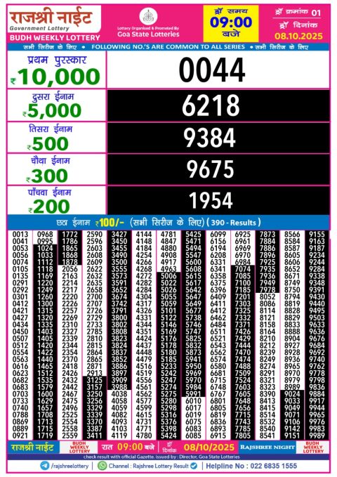 08 October 2025 7.30pm – Goa state Rajshree 50 lotteries 7.30pm Result has been declared for 08/10/2025 . First prize…
