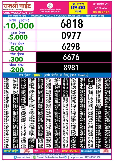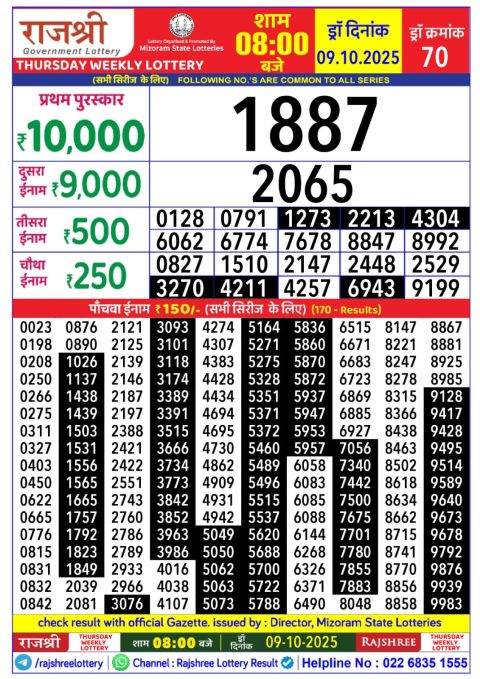 Rajshree Weekly Lottery 9 PM Result 09.10.2025