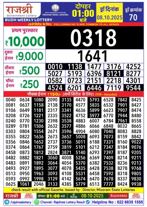 Rajshree 250 Monthly Lottery Result 6.30pm 07.10.2025