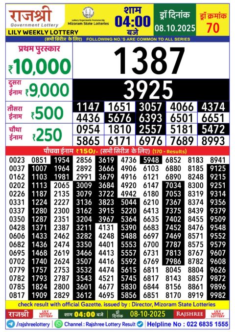 08 October 2025 4pm – Mizoram state Rajshree Lotteries 4pm Result has been declared for 08/10/2025 . First prize rupees…