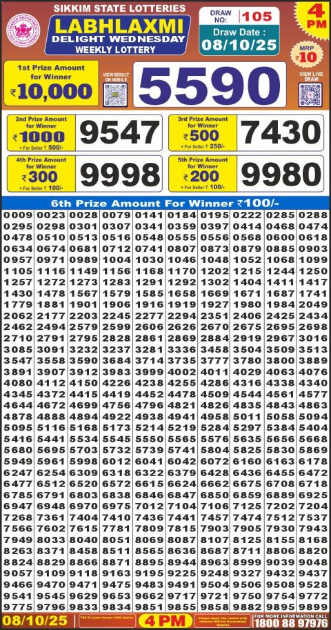 08 October 2025 4pm – Sikkim State Labhlaxmi lottery 4pm Result has been declared for 08/10/2025 . The First prize…