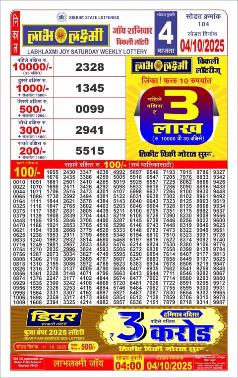 04 October 2025 4pm – Sikkim State Labhlaxmi lottery 4pm Result has been declared for 04/10/2025 . The First prize…