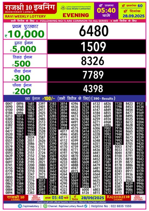 28 September 2025 5.40pm – Goa state Rajshree 10 lotteries 5.40pm Result has been declared for 28/09/2025 . First prize…