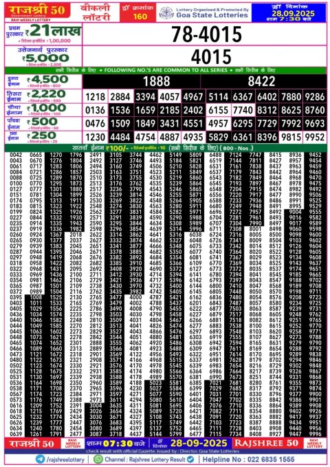 28 September 2025 7.30pm – Goa state Rajshree 50 lotteries 7.30pm Result has been declared for 28/09/2025 . First prize…