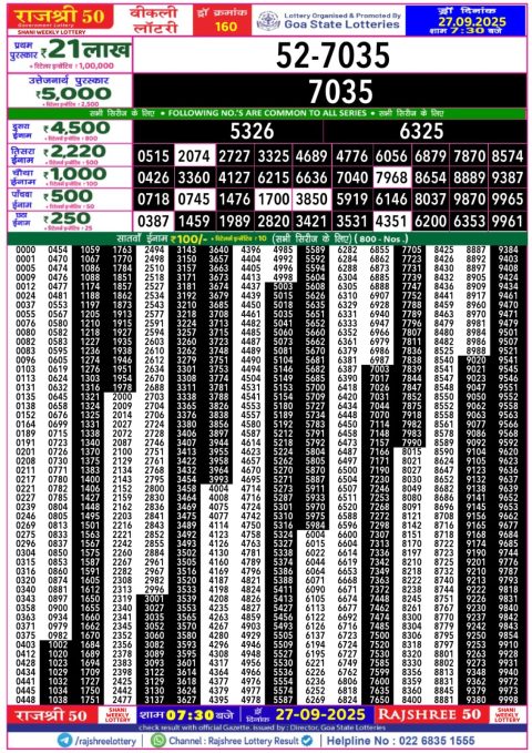 27 September 2025 7.30pm – Goa state Rajshree 50 lotteries 7.30pm Result has been declared for 27/09/2025 . First prize…