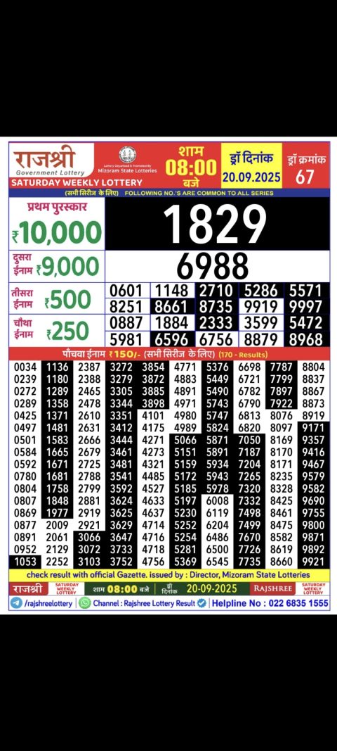 20 September 2025 8pm – Mizoram state Rajshree Lotteries 1pm Result has been declared for 20/09/2025 . First prize rupees…