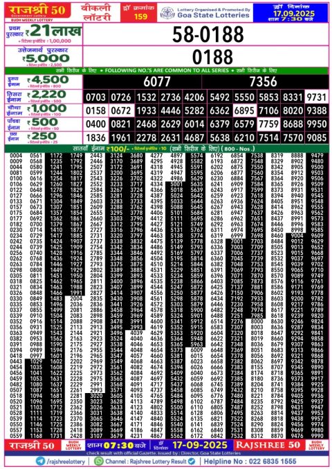 17 September 2025 7.30pm – Goa state Rajshree 50 lotteries 7.30pm Result has been declared for 17/09/2025 . First prize…
