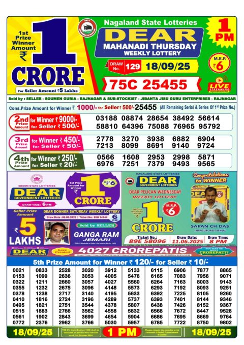 Nagaland State Dear Lottery 1PM Result 18.09.2025