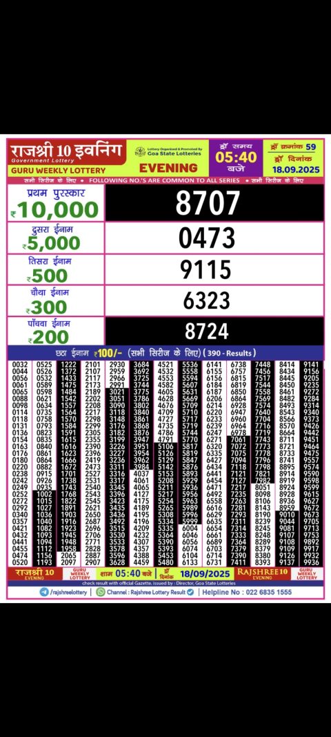 17 September 2025 8.30pm – Goa state Rajshree 30 lotteries 8.30pm Result has been declared for 17/09/2025 . First prize…