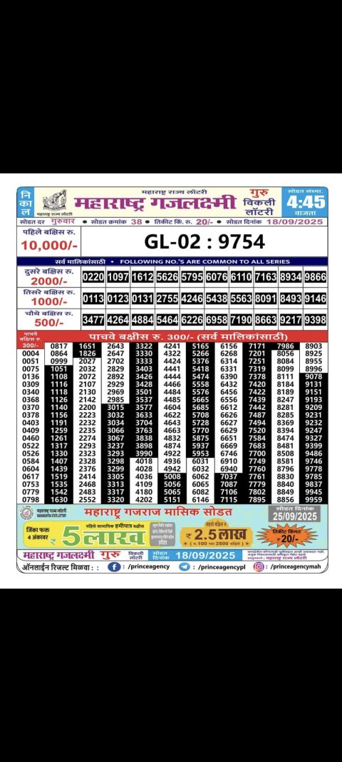 Maharashtra Gajlaxmi Weekly Lottery 4.45PM Result 18.09.2025