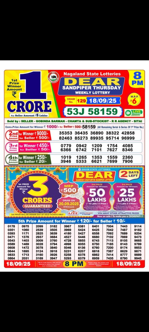 17 September 2025 8pm – Nagaland state lotteries. Dear Lottery 8pm Result has been declared for 17/09/2025 . First prize…