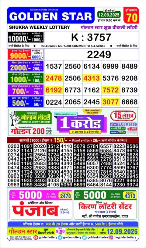 Golden Star Lottery 9PM Result 12.09.2025