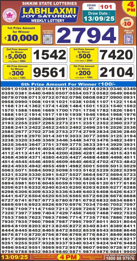 13 September 2025 4pm – Sikkim State Labhlaxmi lottery 4pm Result has been declared for 13/09/2025 . The First prize…