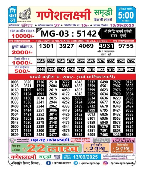 Maharashtra Ganeshlaxmi Weekly Lottery 5PM Result 13.09.2025
