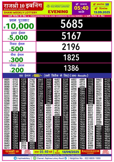 13 September 2025 8.30pm – Goa state Rajshree 30 lotteries 8.30pm Result has been declared for 13/09/2025 . First prize…