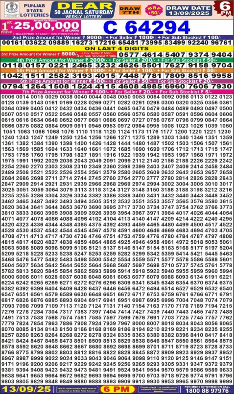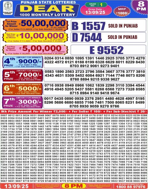 13 September 2025 8pm -Punjab State dear 1000 monthly lotteries 8pm Result has been declared for 13/09/2025 . First and…