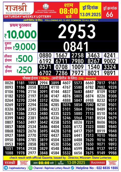 13 September 2025 4pm – Mizoram state Rajshree Lotteries 4pm Result has been declared for 13/09/2025 . First prize rupees…