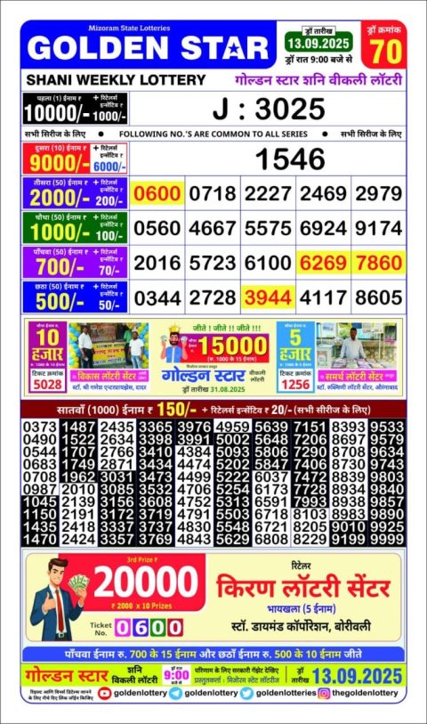 Golden Star Lottery 9PM Result 13.09.2025
