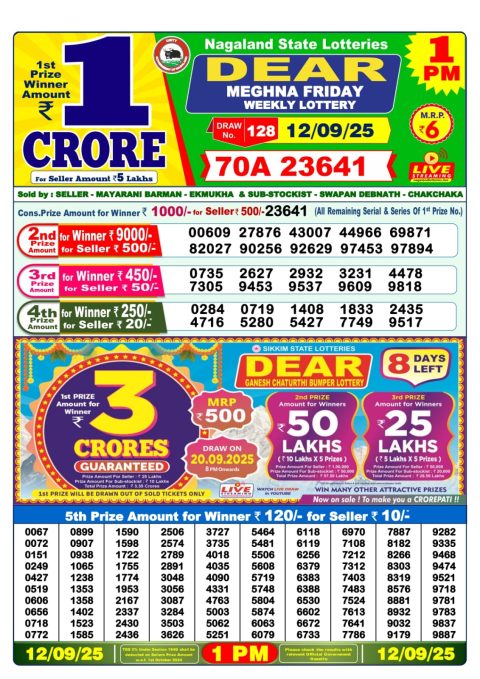 12 September 2025 1pm – Nagaland state lotteries. Dear Lottery 1pm Result has been declared for 12/09/2025 . First prize…