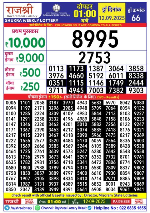 12 September 2025 1pm – Mizoram state Rajshree Lotteries 1pm Result has been declared for 12/09/2025 . First prize rupees…