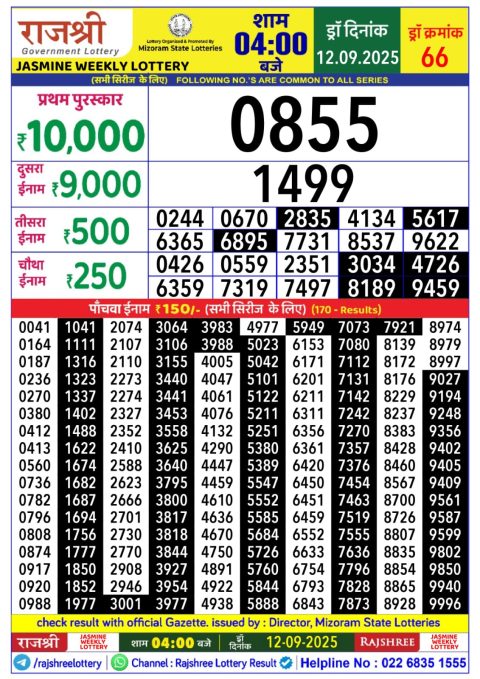 12 September 2025 4pm – Mizoram state Rajshree Lotteries 4pm Result has been declared for 12/09/2025 . First prize rupees…